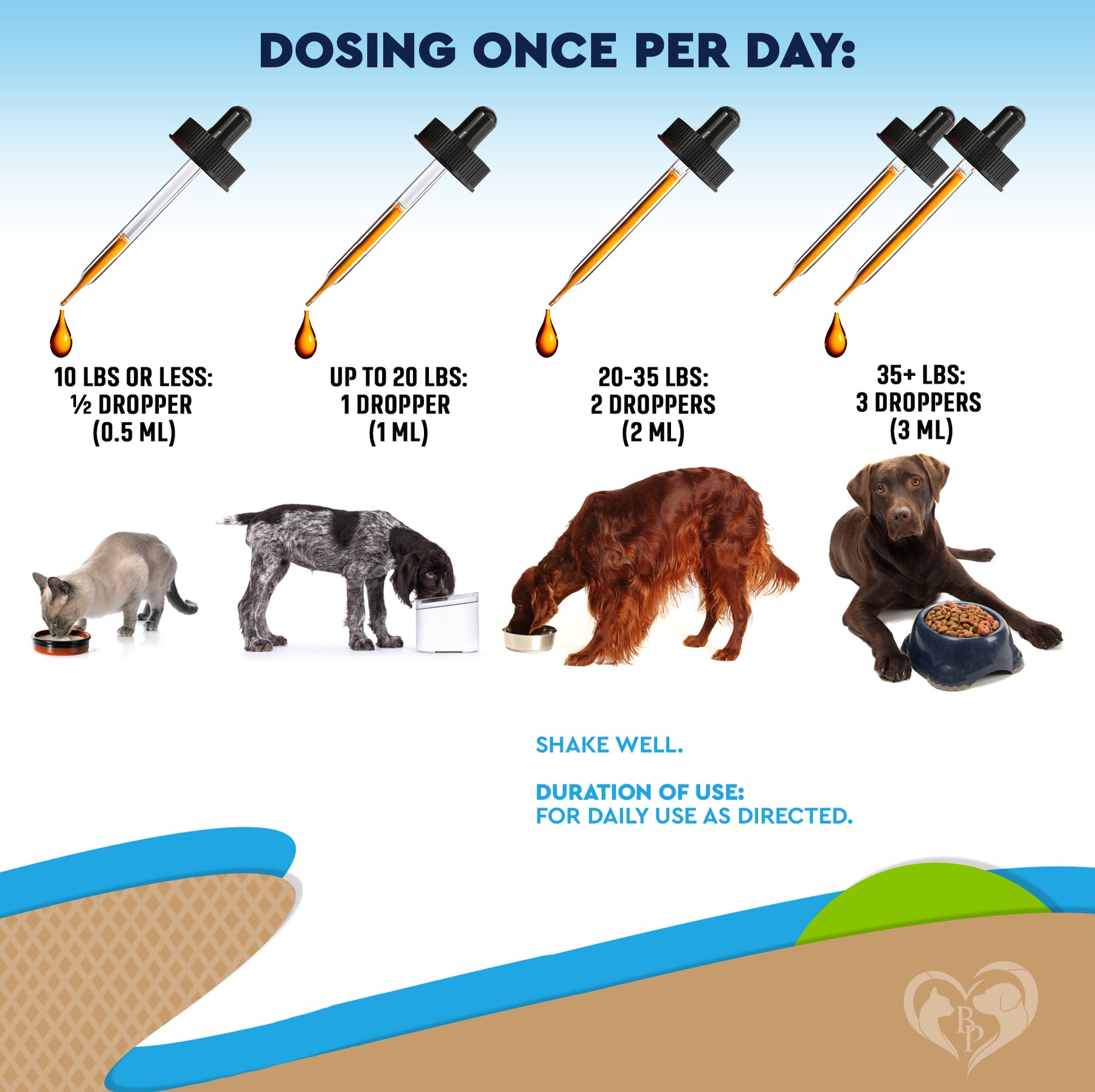 With regular use, this supplement helps keep your pets in peak condition all year round. Use the following guide for dosage:
